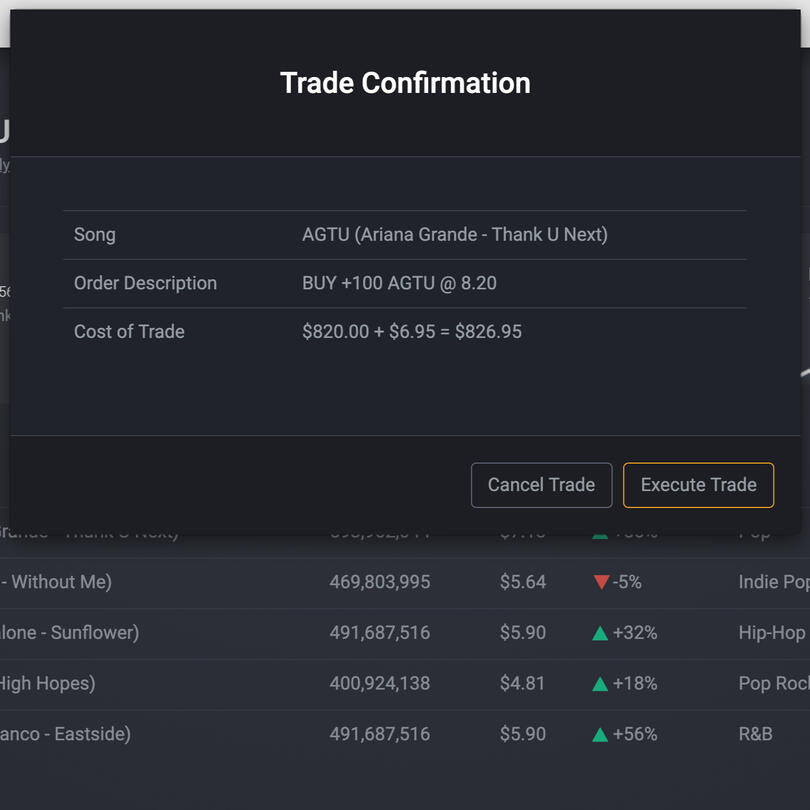 Trustream is the exclusive trading platform for Music Futures Exchange. It’s built for speed and ease of use, and will be available on Mac, Windows, iOS, and Android.